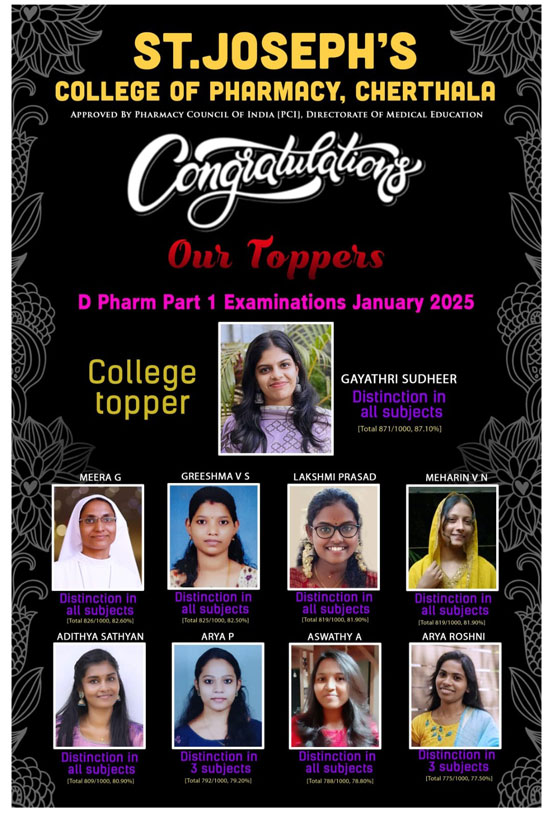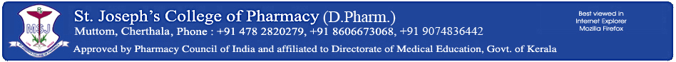 humanity devoid of profit motive.The College offers two years D.Pharm programme approved by the Pharmacy Council of India and affiliated to the Directorate of Medical Education, Govt. of Kerala. The institute enjoys great academic excellence. Our Vision Inspired by Jesus Christ the Divine Healer, Medical Sisters of St. Joseph (MSJ) is deeply committed to mould quality professionals with character and competence to touch the humanity with a compassionate heart and bring about wholeness. Our Mission As catholic health care providers deep rooted in gospel values, MSJ Educational mission aims at striving to continue the healing mission of Jesus Christ through creating commited, compassionate, skillful and integrated professionals who are responsible to build up a healthy family, society and nation.
